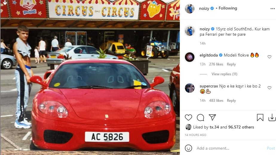Në postimin e fundit, Noizy u shpreh se ajo ishte hera e parë që kishte parë “Ferrari” live, ndërsa ishte vetëm 15 vjeç, kurse tani ëndrrën e ka bërë realitet.
