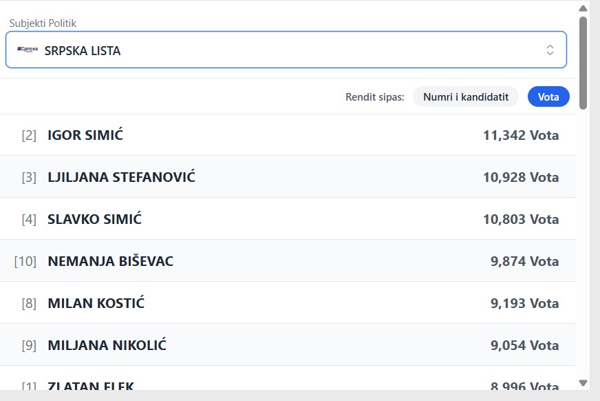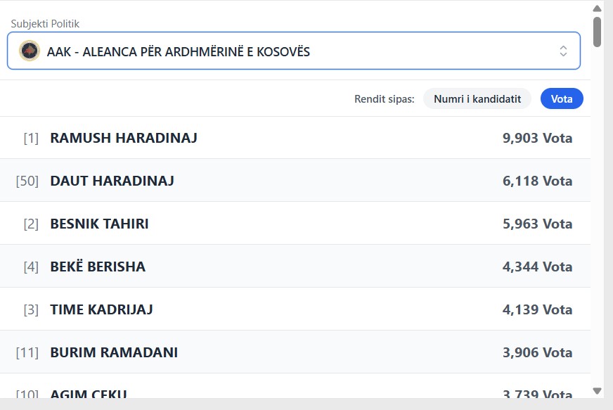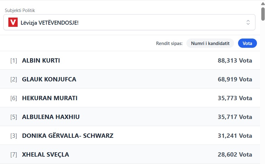Të dhënat e publikuara në uebfaqen e KQZ-së deri tash kanë pasqyruar edhe kandidatët më të votuar të secilit subjekt. Në Lëvizjen Vetëvendosje, lideri i saj Albin Kurti ndiqet me vota nga Glauk Konjufca, Hekuran Murati, Albulena Haxhiu, Donika Gërvalla-Schwarz, Xhelal Sveçla, Hajrulla Çeku, Avni Dehari, Mimoza Kusari-Lila e Ejup Maqedonci në top-dhjetëshen më të votuar në koalicionin fitues të VV-së me Guxo-n dhe Alternativën.