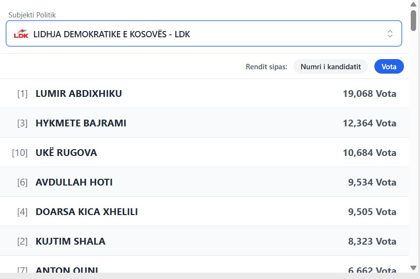 Te Lidhja Demokratike, që ka pësuar rënien më të madhe, pas kryetarit Lumir Abdixhiku më të votuarit janë Hykmete Bajrami, Ukë Rugova, Avdullah Hoti, Doarsa Kica-Xhelili, Kujtim Shala, Anton Quni, Armend Zemaj, Lutfi Haziri e Janina Ymeri. Te LDK-ja, emra të rinj në këtë top-dhjetëshe janë Ukë Rugova e Janina Ymeri.