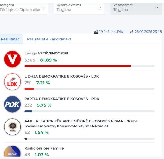 Sipas të dhënave të publikuara nga KQZ në orën 23:48, deri më tani janë numëruar 44.19% e kutive të votimit. Nga rezultatet e deritanishme, Lëvizja Vetëvendosje kryeson me 81.89% të votave, e ndjekur nga LDK me 7.21%, PDK me 5.75%, AAK-Nisma me 1.54% dhe Koalicioni për Familjen me 1.07%.