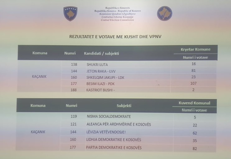 Nga këto vota prin kandidati i Partisë Demokratike e Kosovës, Besim Ilazi, doli i pari me 107 vota.