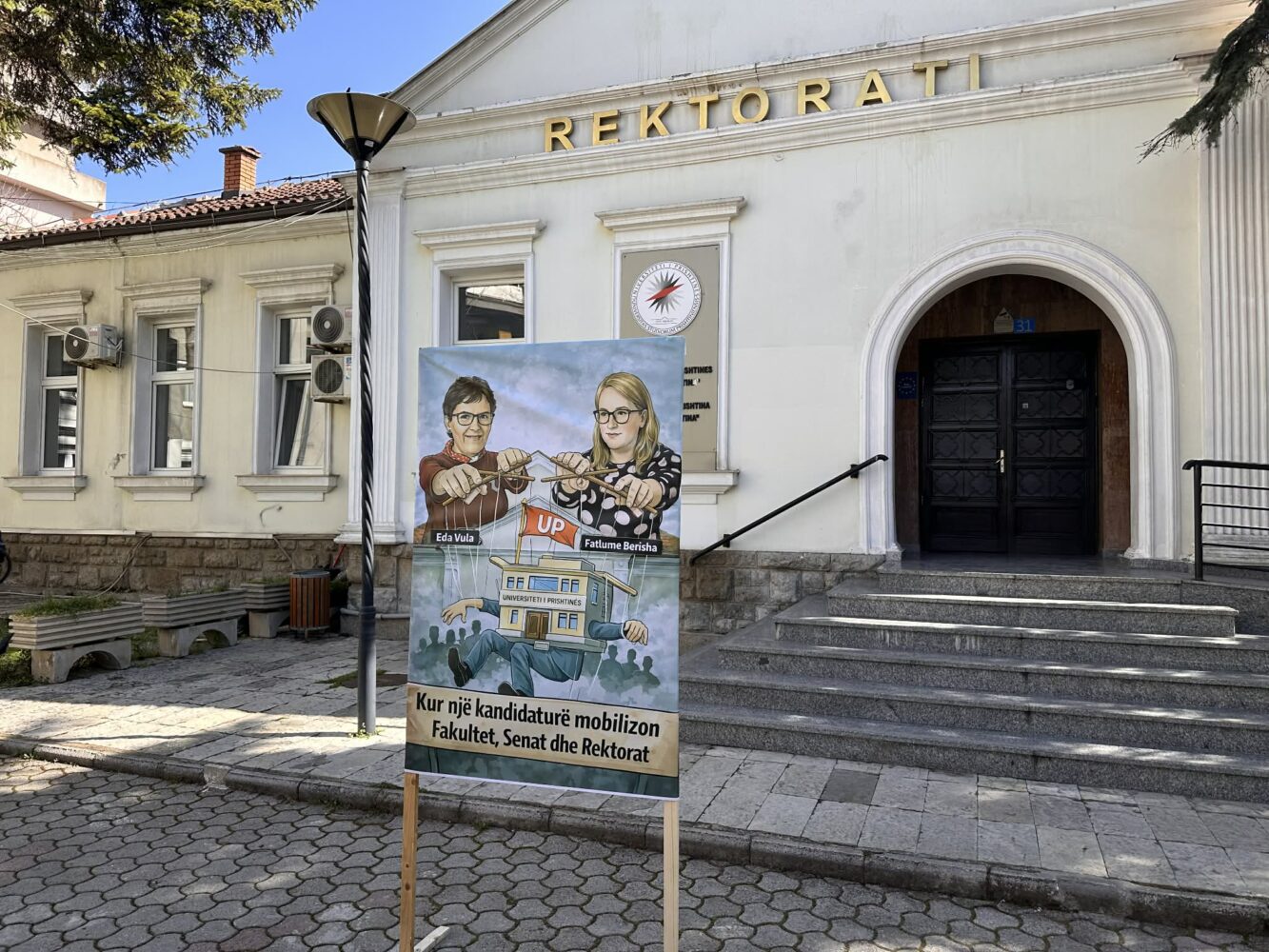 “Kur një kandidaturë mobilizon Fakultet, senat dhe rektorat”, është ky mbishkrimi në një pankartë të vendosur me figurën e Eda Vulës dhe Fatlume Berishës, përmes të cilës organizata “ORCA” mbajti një aksion simbolik para Rektoratit të Universitetit të Prishtinës, për të kundërshtuar avancimin e profesoreshës Fatmire Berisha, raporton Ekonomia Online.