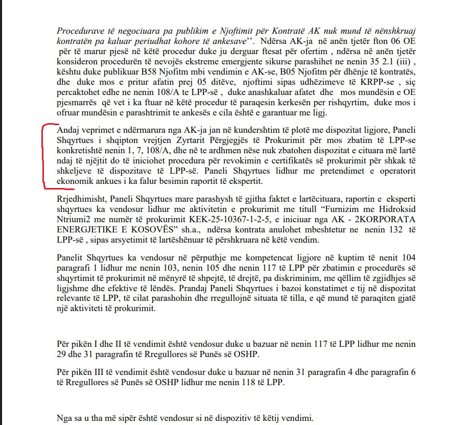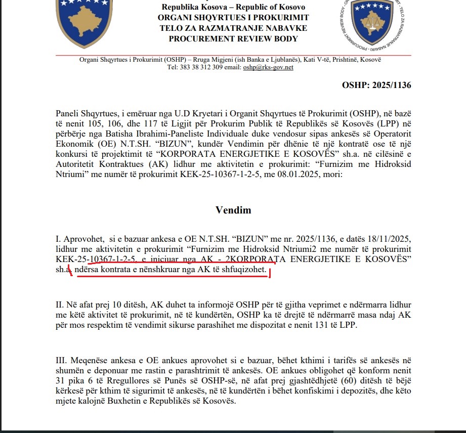 Organi Shqyrtues i Prokurimit (OSHP) ka marrë vendim lidhur me aktivitetin e prokurimit të Korporatës Energjetike të Kosovës (KEK) për “Furnizim me Hidroksid Natriumi”. Paneli Shqyrtues, ka aprovuar si të bazuar ankesën e operatorit ekonomik N.T.SH. “BIZUN” dhe ka vendosur që kontrata e nënshkruar nga autoriteti kontraktues të shfuqizohet. Vendimi, i nxjerrë nuk mbyllet vetëm me anulimin e kontratës. Ai shkon edhe më tej, duke e cilësuar rrjedhën e procedurës si në kundërshtim me Ligjin për Prokurim Publik, dhe duke i shqiptuar vërejtje zyrtare Zyrtarit Përgjegjës të Prokurimit me paralajmërim të hapur se, nëse shkeljet përsëriten, mund të iniciohet procedurë për revokimin e certifikatës së prokurimit, shkruan Demokracia.com.