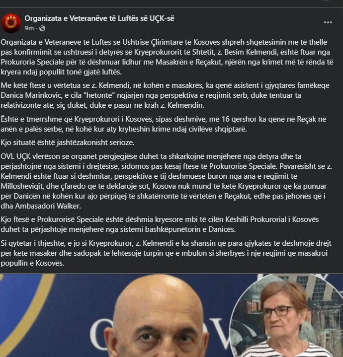 OVL UÇK vlerëson se organet përgjegjëse duhet ta shkarkojnë menjëherë nga detyra dhe ta përjashtojnë nga sistemi i drejtësisë, sidomos pas kësaj ftese të Prokurorisë Speciale. Pavarësisht se z. Kelmendi është ftuar si dëshmitar, perspektiva e tij dëshmuese buron nga ana e regjimit të Millosheviqit, dhe çfarëdo që të deklarojë sot, Kosova nuk mund të ketë Kryeprokuror që ka punuar për Danicën në kohën kur ajo përpiqej të shkatërronte të vërtetën e Reçakut, edhe pas jehonës që i dha Ambasadori Ëalker.