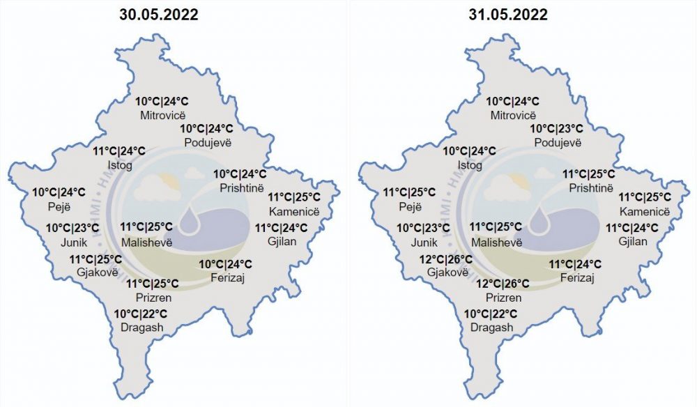 Minimalet do të lëvizin ndërmjet 10-15 gradë Celsius, ndërsa maksimalet e ditës parashihen të lëvizin ndërmjet 24-32 gradë Celsius. Indeksi UV do t’i mbaj vlerat e larta. Do të fryjë erë nga drejtimi i juglindjes dhe jugperëndimit me shpejtësi 1-8m/s.