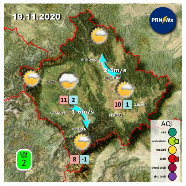 Sipas Prishtina Weather e mërkura do të sjell mot kryesisht me vranësira, pasdite vende-vende intervale të shkurta me diell. Nuk përjashtohen mundësi për ndonjë rigë lokale shiu. Temperaturat në vise të ulëta 5C deri 12C, e në vise malore 2C deri 6C. Era do të fryj e lehtë dhe mesatare nga verilindja 3-8m/s. Indeksi UV: 1.
