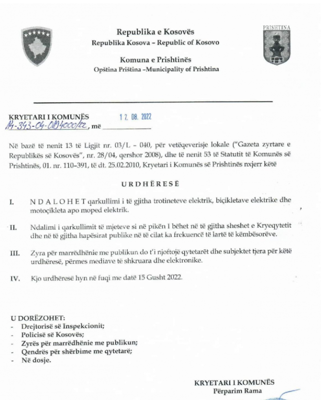 Që nga muajin gusht i vitit të kaluar, Komuna e Prishtinës ka marrë vendim për ndalimin e trotinetëve, biçikletave dhe të gjitha mjeteve me veprim motorik ose elektrik në sheshet e kryeqytetit. Po ashtu është ndaluar lëvizja edhe në vendet ku ka frekuentim të madh të këmbësorëve.