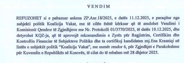 PZAP sot ka marrë vendim përmes të cilit ka refuzuar ankesën e koalicionit VAKAT, përmes të cilës kërkohej që Ena Krasniqi të regjistrohej si pjesë e listës për deputetë të kësaj partie.