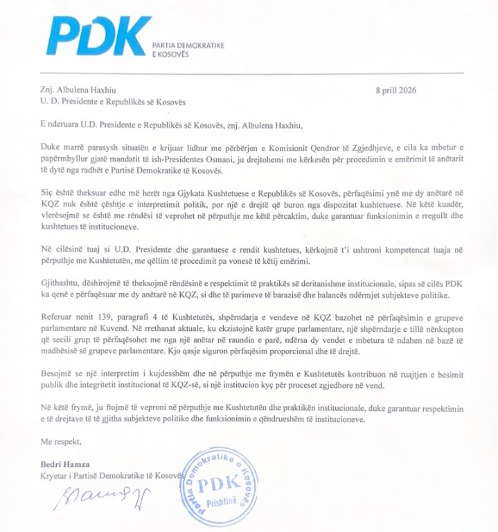 Përmes, një komunikate për media bëhet e ditur se në kërkesë theksohet se çështja e përbërjes së KQZ-së ka mbetur e papërfunduar gjatë mandatit të ish-Presidentes Vjosa Osmani dhe se përfaqësimi i PDK-së me dy anëtarë në këtë institucion nuk është çështje interpretimi politik, por një e drejtë që rrjedh nga dispozitat kushtetuese.