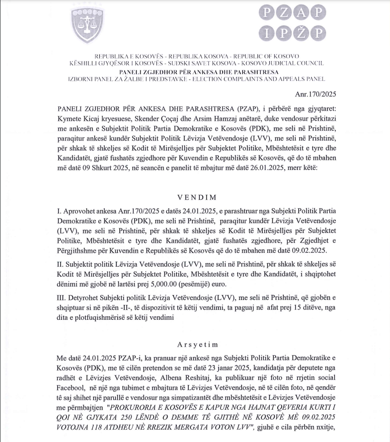Ankesa e PDK-së e cila është aprovuar nga PZAP-ja dhe kishte lidhje me kandidaten për deputete nga radhët e LVV-së, Albena Reshitaj e cila në rrjetin social Facebook, ka publikuar një fotografi nga tubimet e LVV-në, në të cilën shihet një parullë e vendosur me përmbajtjen “Prokuroria e Kosovës e kapur nga hajnat. Qeveria Kurti i qoi në gjykata 250 lëndë 0 dënime të gjithë në Kosovë më 9 shkurt 2025. Votojna 118 atdheu është në rrezik, mërgata votoni LVV”, gjuhë e cila përbën nxitje, urrejtje, ofendim, denigrim dhe shprehë ngjyrime përçmuese ose nënvlerësuese për partitë kundërshtare të LVV-së.