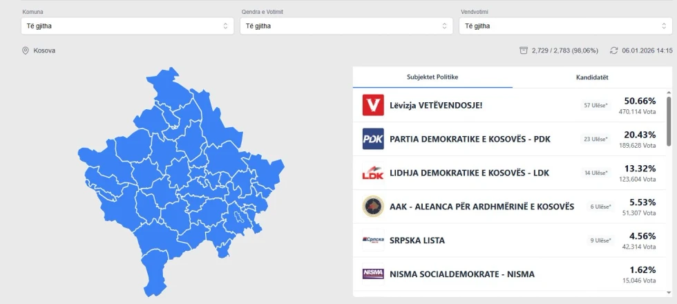 Lëvizja Vetëvendosje si fituese e zgjedhjeve një ditë më parë mbërriti në 57 ulëse në Kuvend, duke e marrë një nga PDK-ja që pas rezultateve preliminare i kishte 23. Sipas llogaritjeve aktuale, tani në Kuvend rikthehet Bekim Haxhiu i PDK-së.