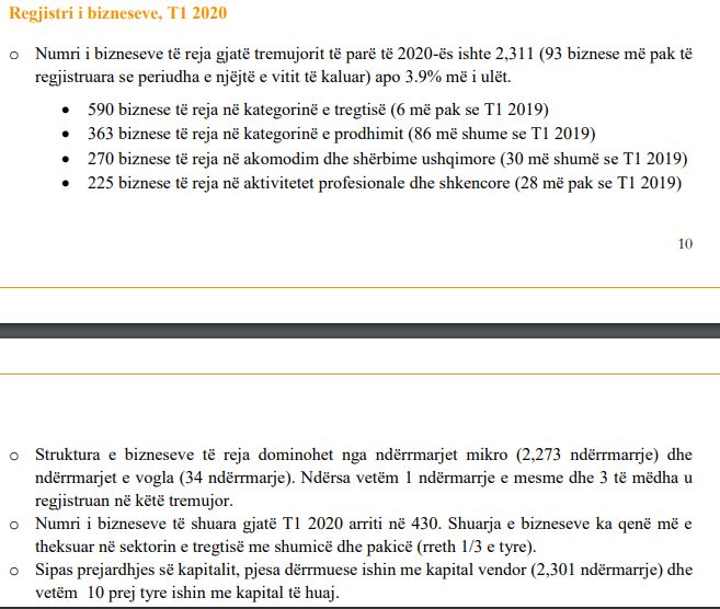 “Numri i bizneseve të reja gjatë tremujorit të parë të 2020-ës ishte 2,311 (93 biznese më pak të regjistruara se periudha e njëjtë e vitit të kaluar) apo 3.9% më i ulët. 590 biznese të reja në kategorinë e tregtisë (6 më pak se T1 2019), 363 biznese të reja në kategorinë e prodhimit (86 më shume se T1 2019), 270 biznese të reja në akomodim dhe shërbime ushqimore (30 më shumë se T1 2019), 225 biznese të reja në aktivitetet profesionale dhe shkencore (28 më pak se T1 2019)”, thuhet në raport.
