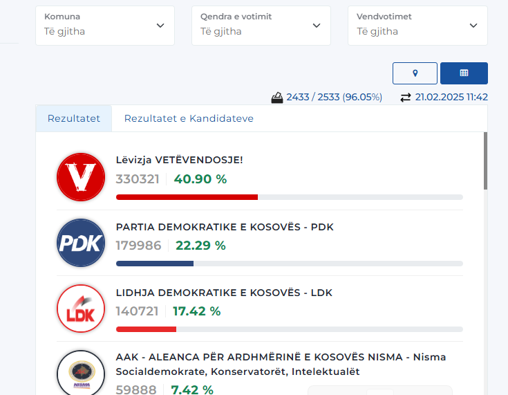 Sipas këtyre rezultateve, deri në ora 11:42 të datës 21.02.2025 janë numëruar 2,433 vendvotime nga 2,533 apo 96.05 për qind e tyre.