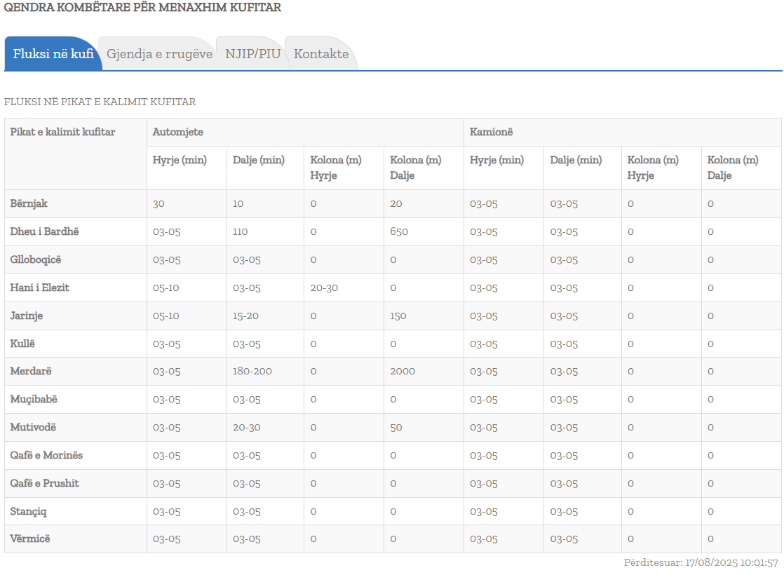 Qendra Kombëtar për Menaxhim Kufitar ka përditësuar të dhënat mbi pritjet në kufi.