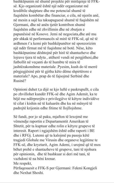 Përfaqësuesit e Federatës së Futbollit të Kosovës në Gjermani, Fekmi Kongjeli dhe Nexhat Shoshi, kanë reaguar ashpër ndaj grupit opozitar të FFK-së, duke i cilësuar si zëdhënës të Serbisë dhe Rusisë pasi që besojnë se ky grup opozitar po manipulon me lajme kinse Kosova do të përjashtohet nga FIFA e UEFA.