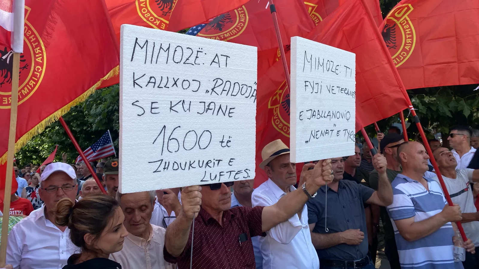 Protestuesit mbanin pankarta me mbishkrime “Mimozë: A t’kallxoj ‘Radoja’ se ku janë 1600 të zhdukurit e luftës”, “Dorëhiqu Mimozë”, “Poshtë Qeveria” etj.