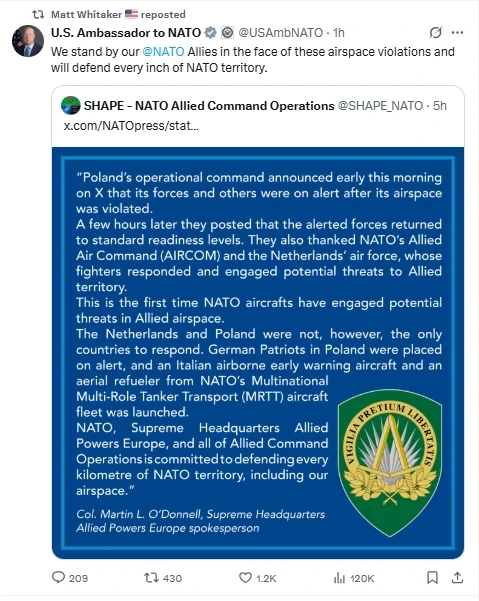 Ambasadori i SHBA-së në NATO, Matthew Whitaker, ka thënë se Uashingtoni mbështet aleatët e saj në NATO pas “shkeljeve” ruse të hapësirës ajrore polake të mërkurën.