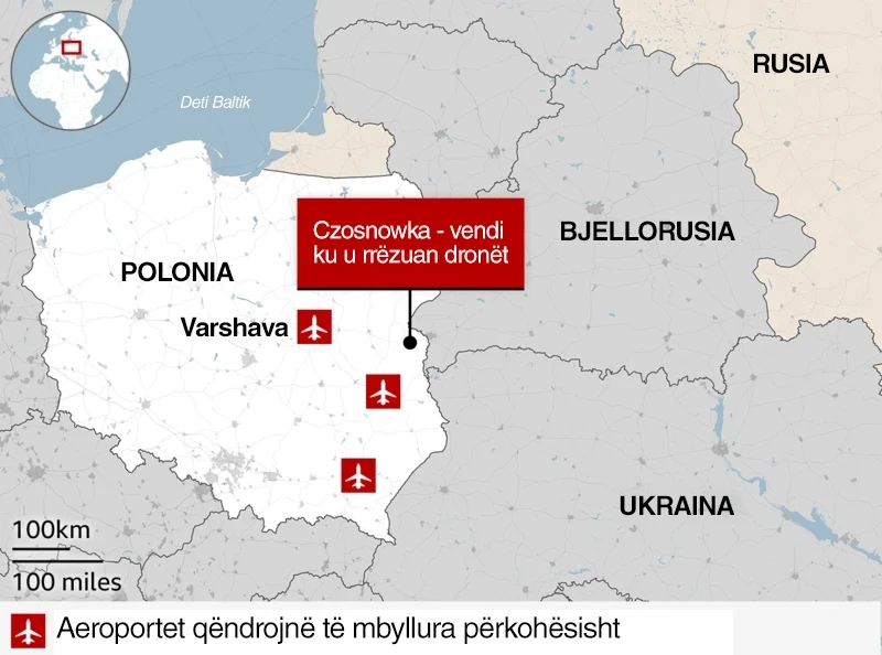 Disa aeroporte polake u mbyllën përkohësisht, përfshirë një që është përdorur si pika kryesore e hyrjes për zyrtarët perëndimorë dhe furnizimet që udhëtojnë drejt Ukrainës nëpërmjet tokës.