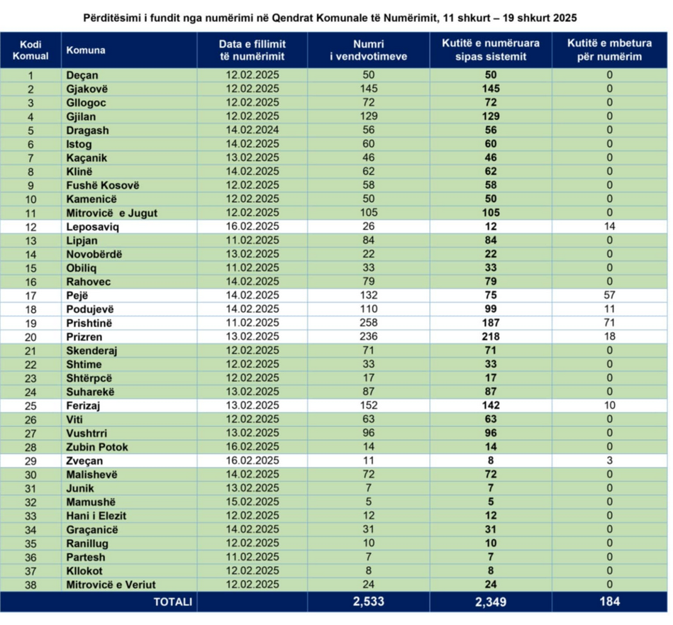 “Sipas të dhënave të pranuara nga Qendrat Komunale të Numërimit, në të cilat është duke vazhduar apo ka përfunduar procesi i numërimit të votave të kandidatëve për deputetë nga Zgjedhjet për Kuvendin e Kosovës, deri më 19 shkurt 2025 janë numëruar 92.73% e vendvotimeve apo 2,349 nga 2,533. Procesi i numërimit ka përfunduar në 31 komuna, ndërkaq është duke vazhduar në Qendrat Komunale të Numërimit në 7 komunat tjera: Leposaviq, Pejë, Podujevë, Prishtinë, Prizren, Ferizaj dhe Zveçan”, thotë KQZ-ja.