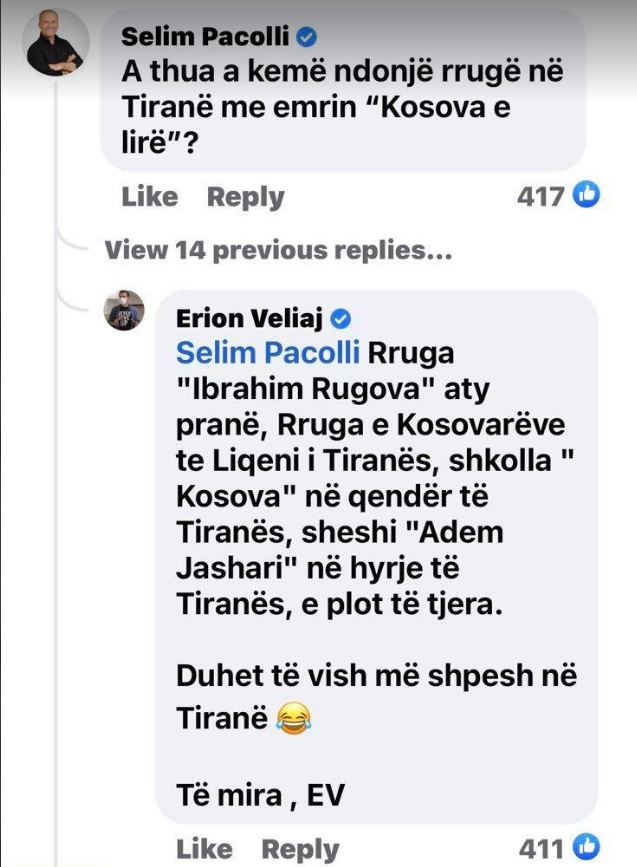 Ish-nënkryetari i Komunës së Prishtinës e ka pyetur të parin e Tiranës nëse ka ndonjë rrugë “Kosova e Lirë”, duke ironizuar me emërtimin e rrugës së re.