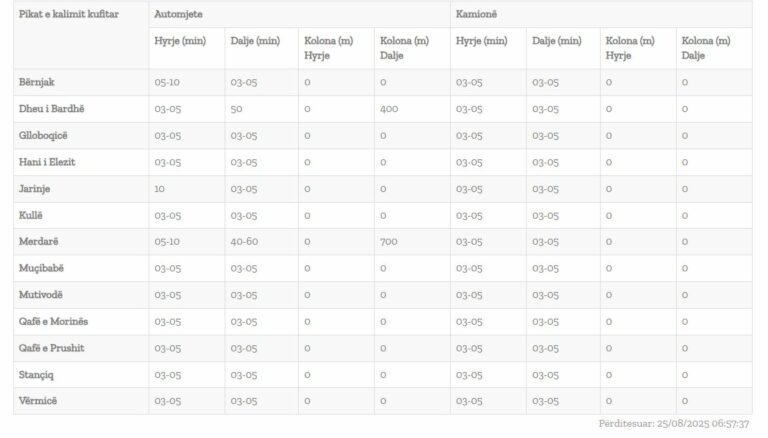 Sipas të dhënave të fundit nga Qendra Kombëtare për Menaxhim Kufitar, pritjet më të gjata janë regjistruar në pikën kufitare në Merdarë ku ato arrijnë deri në 60 minuta.