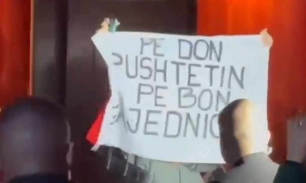 Ajo po mbante një parullë në dorë, ku shkruante “Pe do pushtetin, pe bën Zajednicën”.