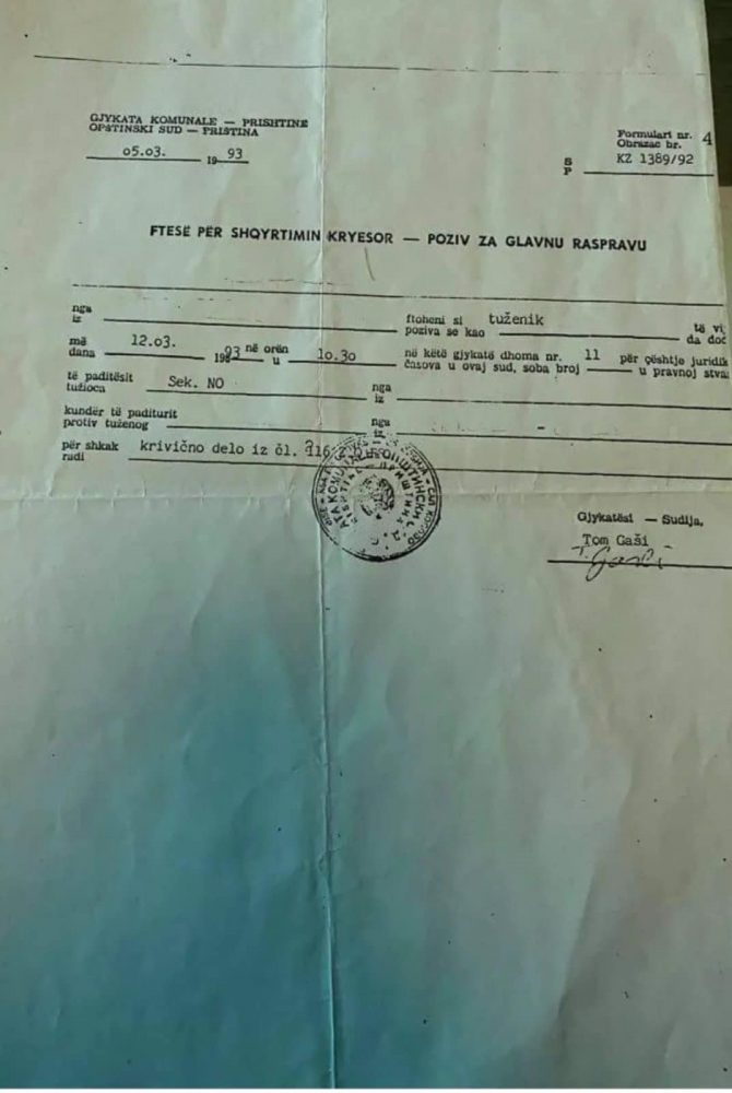 E kam thene ne shume debate televizive se Tomqe ka qene gjykates i Millosheviçit deri ne vitin 1993. Ai ka denu, ka poshtru e shkaterru njereze te cilet kane qene kunder kasapit te Ballkanit. I njejti rrugaç, dhunues e drogagji, po mundohet me na diferencu, me na denu, e me na largu nga puna, permes letrave publike.Shikojeni kete dokument, edhe mbiemrin ja shkruanin serbisht!”, ka shkruar Zeka.