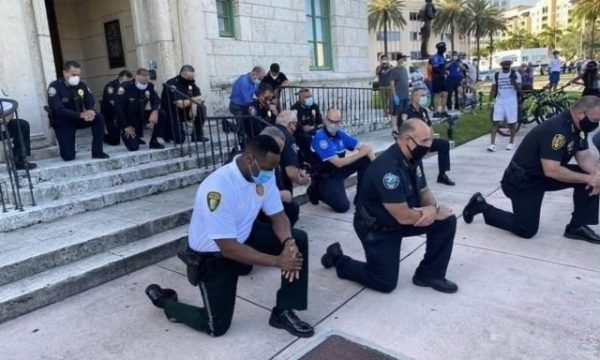 Policia është bashkuar me protestuesit dhe madje janë gjunjëzuar duke kërkuar falje.