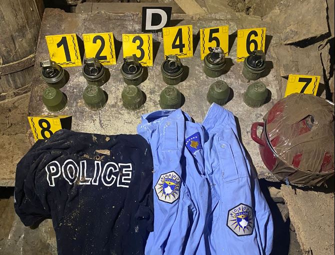 Gjashtë granata dorë, dhe uniforma të Policisë së Kosovës janë gjetur në një shtëpi të baraktisur në një fshat të Zubin Potokot.