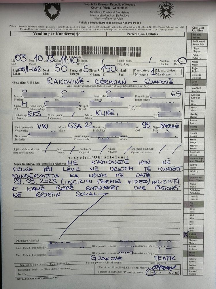 Njësia Rajonale e Komunikacionit Rrugor në Gjakovë, ka arritur të identifikojë automjetin dhe ngasësin e tij i cili me datën 29.09.2023, kishte drejtuar mjetin në fjalë në kahun e kundërt, përkatësisht në kahun e ndaluar të lëvizjes në rrugën Prishtinë-Gjakovë në fshatin Rakovinë, rrugë e cila ka katër shirita të trafikut (nga dy shirita të lëvizjes në një drejtim).