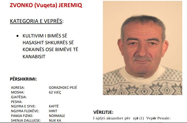 Policia e Kosovës po kërkon ndihmën e qytetarëve për arrestimin e një personi, i cili është në kërkim për veprën penale “Kultivim i bimës së hashashit shkurrës së kokainës ose bimëve të kanabisit”. Bëhet fjalë për 63 vjeçarin nga Gorazhdeci i Pejës, Zvonko Jeremiq.