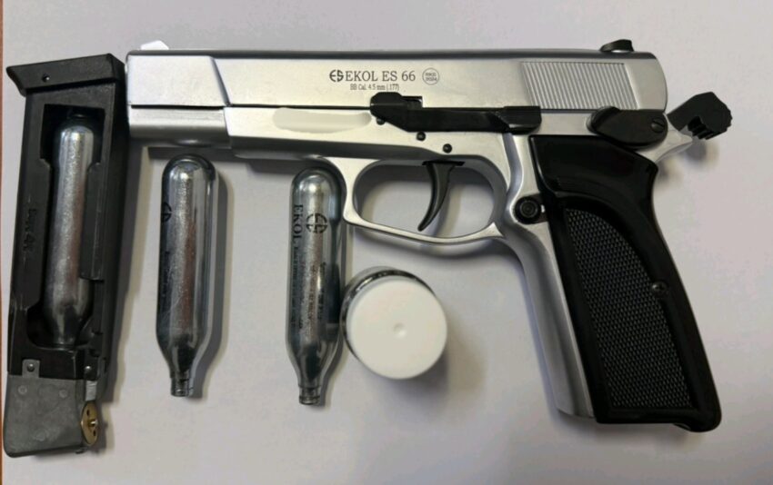 Tre zyrtarë policorë kanë kanë hasur personin me iniciale Rr. B., 33 vjeç. Sipas policisë, i dyshuari posedonte një armë të llojit Ekol me bocë ajri dhe municion me rruza metalike.