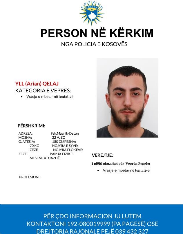 Policia e Kosovës ka publikuar fotografitë e tre personave të dyshuar për plagosjen e ndodhur më 11 janar 2026 në Pejë, me qëllim lokalizimin dhe arrestimin e tyre. Të dyshuarit kërkohen për veprën penale “vrasje e mbetur në tentativë”.
