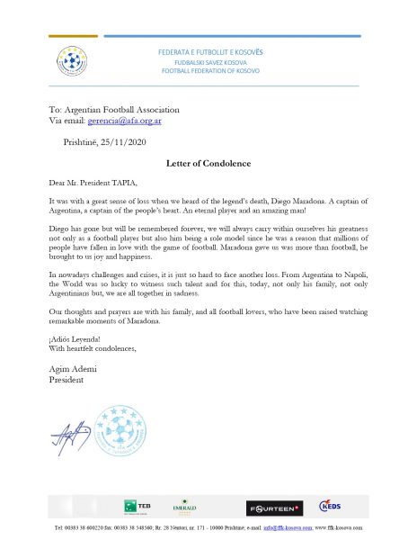 Presidenti Agim Ademi me rastin e vdekjes së Legjendës së futbollit botëror, Diego Armando Maradona i ka dërguar telegram ngushëllimi presidentit të Federatës Argjentinase të Futbollit, Claudio Tapia.