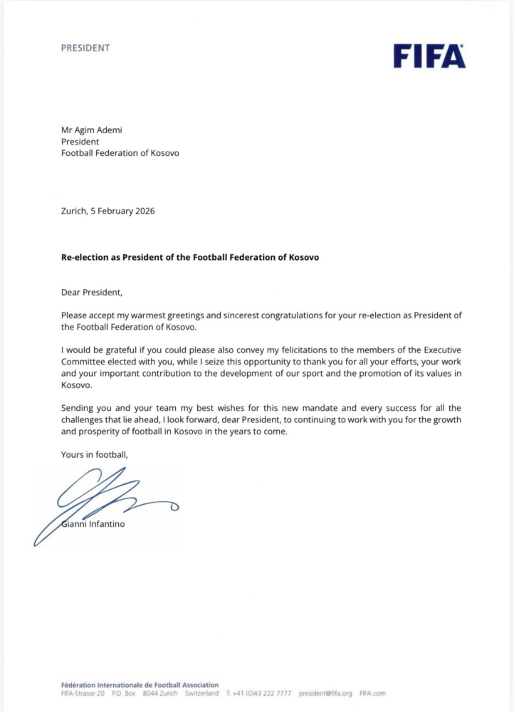 Në letrën e tij, ai ka riafirmuar mbështetjen për zhvillimin e futbollit kosovar.