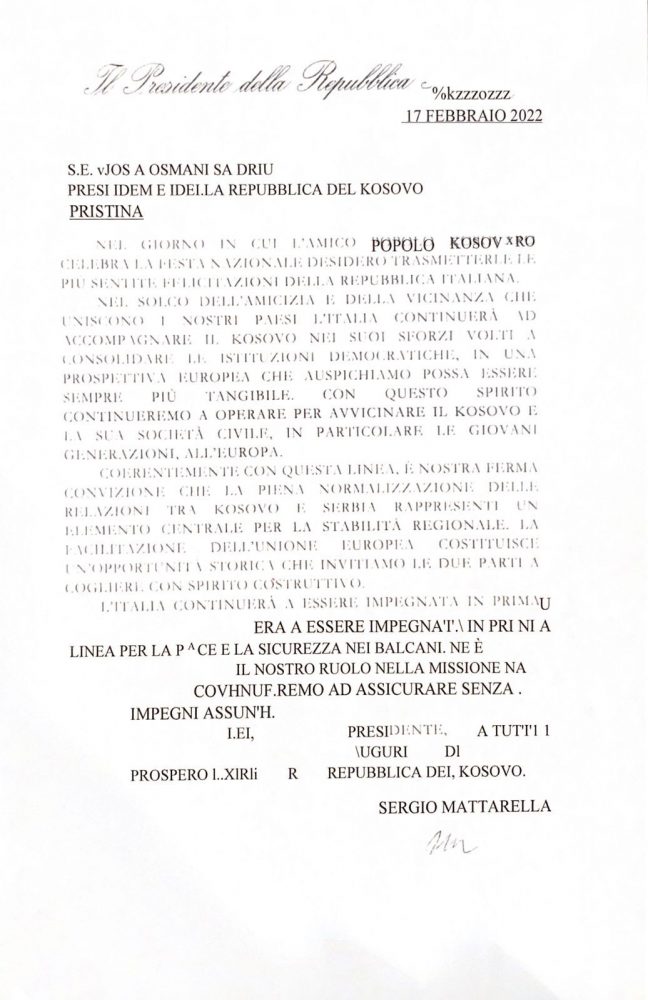Në letrën e Mattarella-s përveç urimit thuhet se, Italia do të vazhdojë të mbështesë Kosovën në përpjekjet e saj për konsolidimin e institucioneve demokratike, në një perspektivë evropiane.