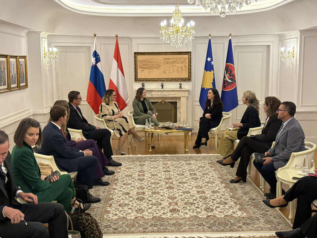 Presidentja e Republikës së Kosovës, Vjosa Osmani sonte priti në takim ministren Federale të Austrisë për Evropë, Integrim dhe Familje, Claudia Plakolm si dhe sekretaren Shtetërore për Çështjet Evropiane, të Drejtën Ndërkombëtare dhe Mbrojtjen e Interesave dhe Diplomacinë Ekonomike, në Ministrinë e Punëve të Jashtme të Republikës së Sllovenisë, Neva Grashiq, raporton Ekonomia Online.