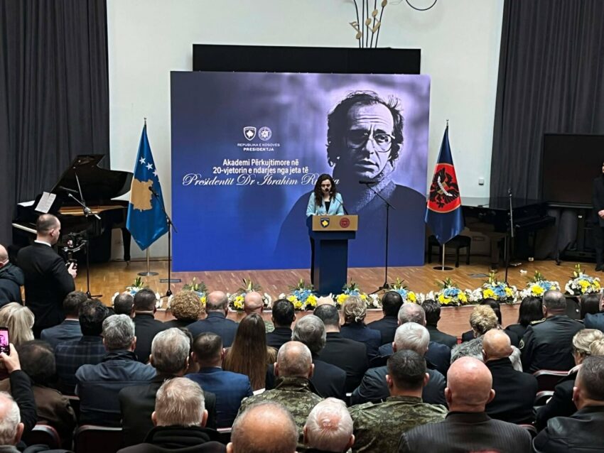 “Sot, 20 vjet pas ndarjes nga jeta të presidentit Ibrahim Rugova, jemi bashkuar për të kujtuar dhe nderuar figurën e tij dhe për ta shënuar momentin kur ideja e tij u bë edhe kulturë politike, ku rezistenca u bë etikë dhe kur politika u ngrit në nivel të misionit historik. Sot nuk përkujtojmë vetëm një datë, por për një epokë që e ndryshoi përgjithmonë rrjedhën e historisë tonë. Askush nuk e mishëroi më thellë e më mirë shprehjen ‘Unë biri yt, Kosovë’, se sa presidenti Rugova. Ai ishte biri i saj në bindje, përkushtim dhe në sakrificë, i lidhur me fijet e tij me popullin dhe vlerat e saj, duke ia kushtuar gjithë jetën, çdo qelizë të tij ndërtimit dhe mbrojtjes së shtetit të lirë, të pavarur dhe demokratik të Kosovës”, tha ajo.