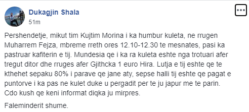 “Pershendetje, mikut tim Kujtim Morina i ka humbur kuleta, ne rrugen Muharrem Fejza, mbreme rreth ores 12.10-12.30 te mesnates, pasi ka pastruar kafiterin e tij. Mundesia qe i ka ra kuleta eshte nga trotuari afer tregut ditor dhe rruges afer Gjithcka 1 euro Hira. Lutja e tij eshte qe te kthehet sepaku 80% i parave qe jane aty, sepse halli tij eshte qe pagat e puntorve i ka pas ne kulet duke u pergadit per te ju japur me te parin”, ka shkruar ai në këtë grup.