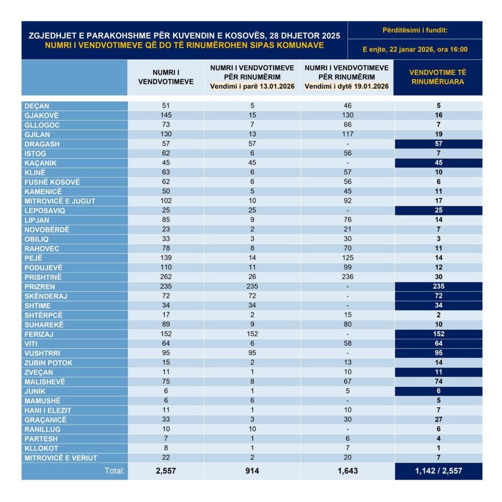 “Nga fillimi i këtij procesi (e martë, 13 janar 2026, ora 18:00) dhe deri më tani (e enjte, 22 janar 2026, ora 16:00) janë rinumëruar rreth 45% apo 1,142 nga 2,557 vendvotime. Sipas këtyre të dhënave, deri më tani rinumërimi është përmbyllur plotësisht në 11 komuna”, thuhet në njoftim.