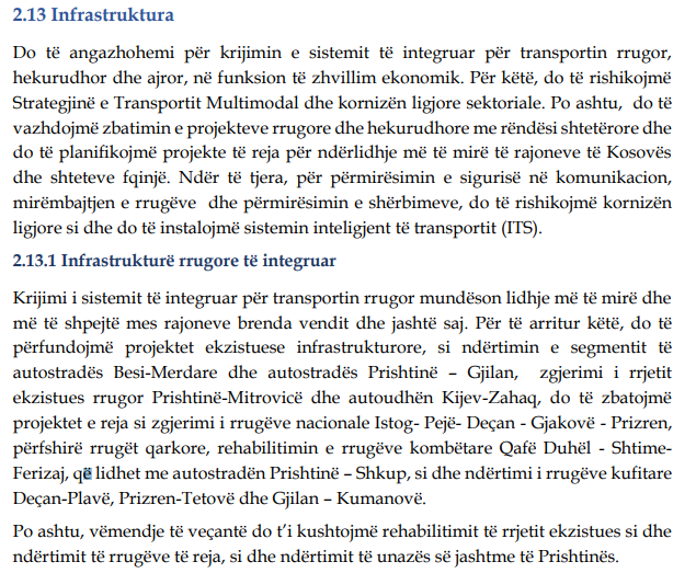 Ndër premtimet tjera të Qeverisë është edhe përmirësimi i infrastrukturës rrugore. Në planet e qeverive të kaluara ka qenë edhe ndërtimi i Autostradës së Dukagjinit i cili parashihte ndërtimin e trasesë së re karshi asaj ekzistuese.