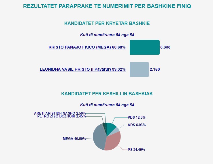 Bashkia e Finiqit është fituar nga kandidati i Partisë Mega (Minoriteti Etnik Grek për të Ardhmen) Kristo Kiço, i cili përballë kishte një kandidat të pavarur (Leonidha Hristo).