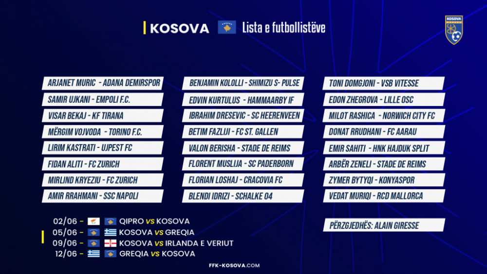 Selektori i Kombëtares së Kosovës, Alain Giresse e ka publikuar sot listën e futbollistëve të ftuar për ndeshjet e qershorit.
