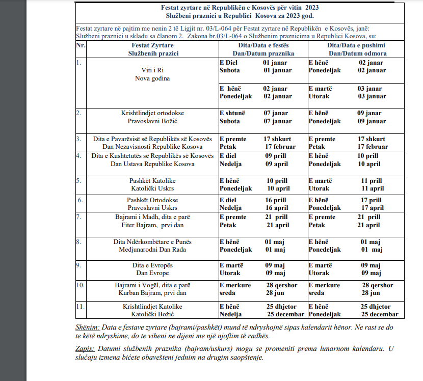 Sot e nesër, punëtorët e shtetit do ta kenë pushim. Kjo pasi që ata do të përfitojnë nga dy data të festave zyrtare të cilat ranë në vikend, mirëpo sipas Ligjit të Festave zyrtare, për to pushohet në një ditë pune.