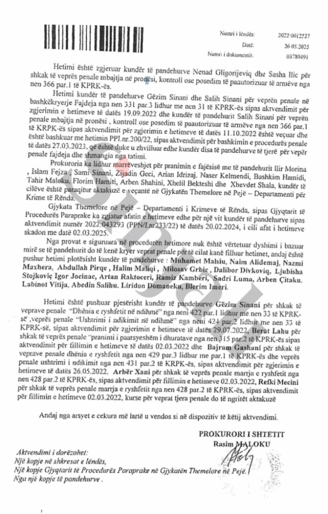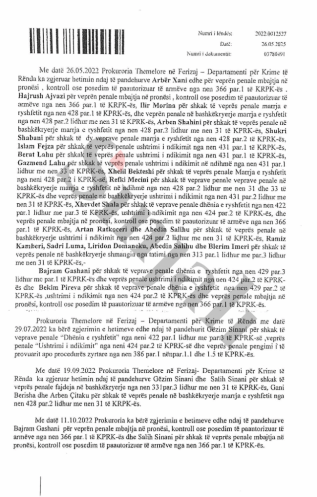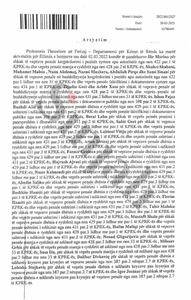 Prokuroria Themelore në Ferizaj – Departamenti për Krime të Rënda ka vendosur të pushojë hetimet ndaj një grupi të madh të dyshuarish, përfshirë zyrtarë publikë dhe persona të tjerë.