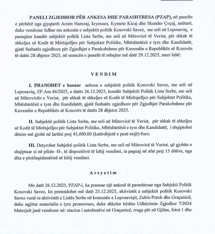 Paneli Zgjedhor për Ankesa dhe Parashtresa (PZAP) ka gjobitur subjektin politik Lista Serbe, me seli në Mitrovicë të Veriut, me 45,000 euro për shkelje të Kodit të Mirësjelljes gjatë fushatës zgjedhore për zgjedhjet e parakohshme parlamentare të 28 dhjetorit 2025.