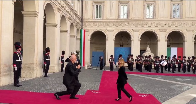 Rama pritet me ceremoni zyrtare në Romë, kryeministri i ulet në gjunjë Melonis