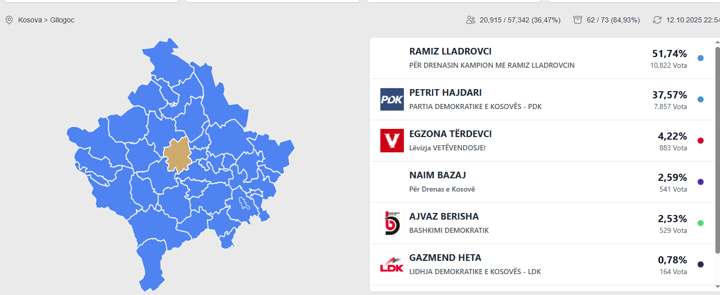 Kur janë numëruar mbi 80 për qind të votave, Lladrovci ka 10.822 vota apo 51.74% dhe pritet ta drejtojë komunën edhe për katër vjet.