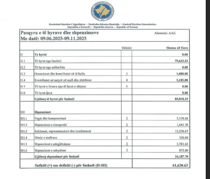 Ndërsa AAK e Ramush Haradinajt ka shpenzuar më së paku për fushatë, duke raportuar vetëm 24 mijë e 187 euro dhe të hyra rreth 86 mijë euro.