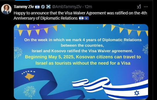 “Gëzohem t’ju njoftoj se Marrëveshja për heqjen e vizave u ratifikua në përvjetorin e katërt të Marrëdhënieve Diplomatike Izrael-Kosovë”, shkroi ajo në një postim në X.